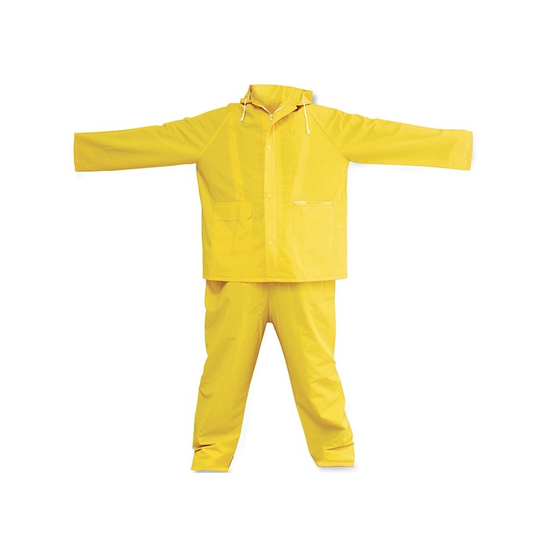 IMPERMEABLES DE 2 PZAS, 100% PVS, INTERIOR DE POLIESTER, CON BOLSAS EXTERIORES EN GABARDINA, CAPUCHA FIJA, JUNTAS DESELLADO DE ALTA FRECUENCIA.