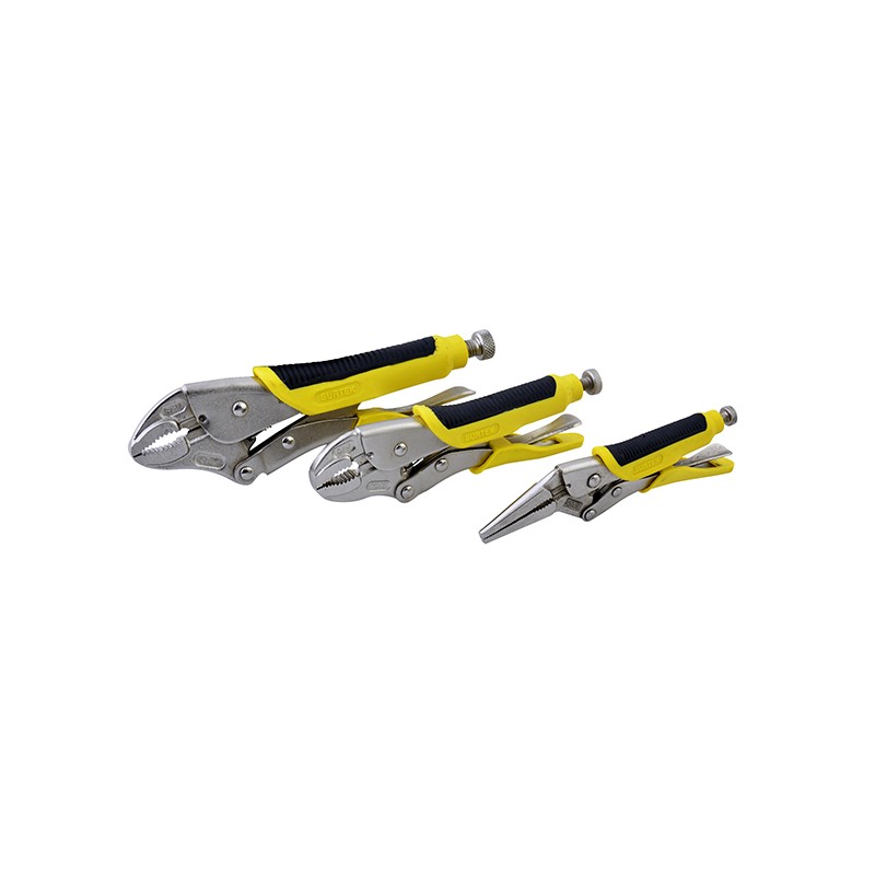 JUEGO CON 3 PINZAS DE PRESIÓN CUENTA CON 1 PINZA DE NARIZ LARGA DE 6 1/2", 1 QUIJADA CURVA DE 7", 1 QUIJADA CURVA DE 10".