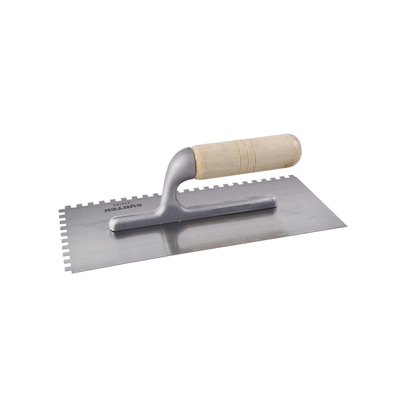 LLANA CON MUESCAS EN UN LADO Y UN EXTREMO, SE UTILIZA PARA APLICAR EL MORTERO DE MATERIAL DE FRAGUADO U OTROS TIPOS DE ADHESIVO QUE SE USAN PARA INSTALAR BALDOSAS DE PIEDRAS NATURALES Y DE CERÁMICA, FACHALETAS Y PISOS DE GRANDES DIMENSIONES.