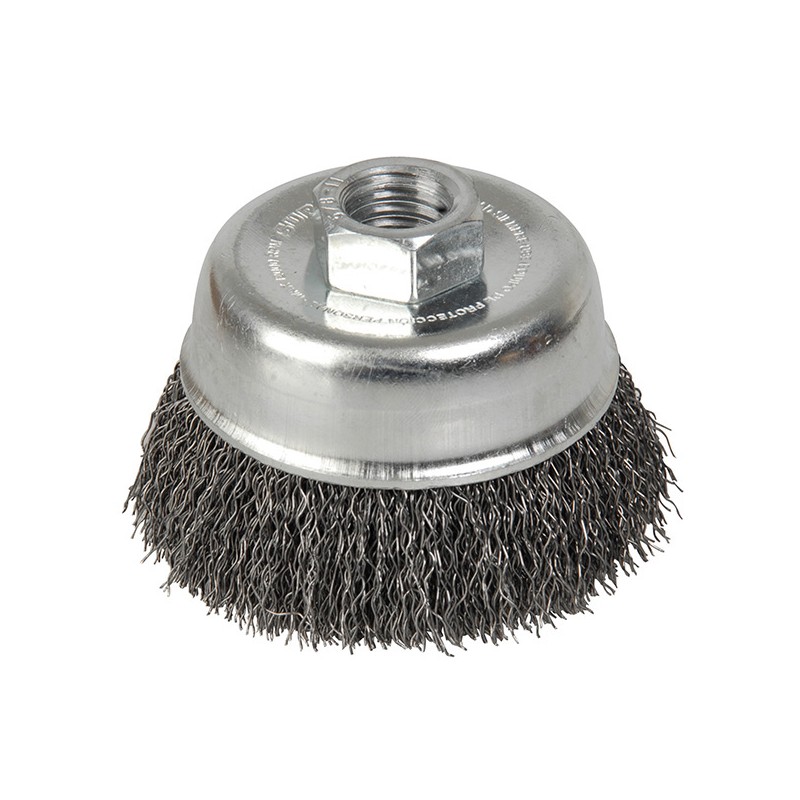 CARDA DE COPA ONDULADA DE UN DIAMETRO DE 3" ROSCA DE 5/8",EN ALAMBRE DE ACERO ALTO CARBONO, ONDULADO, CALIBRE 0.35MM. MAX 6,000 RPM, ELIMINAN OXIDOS, PINTURAS Y ADHERENCIAS EN GENERAL.