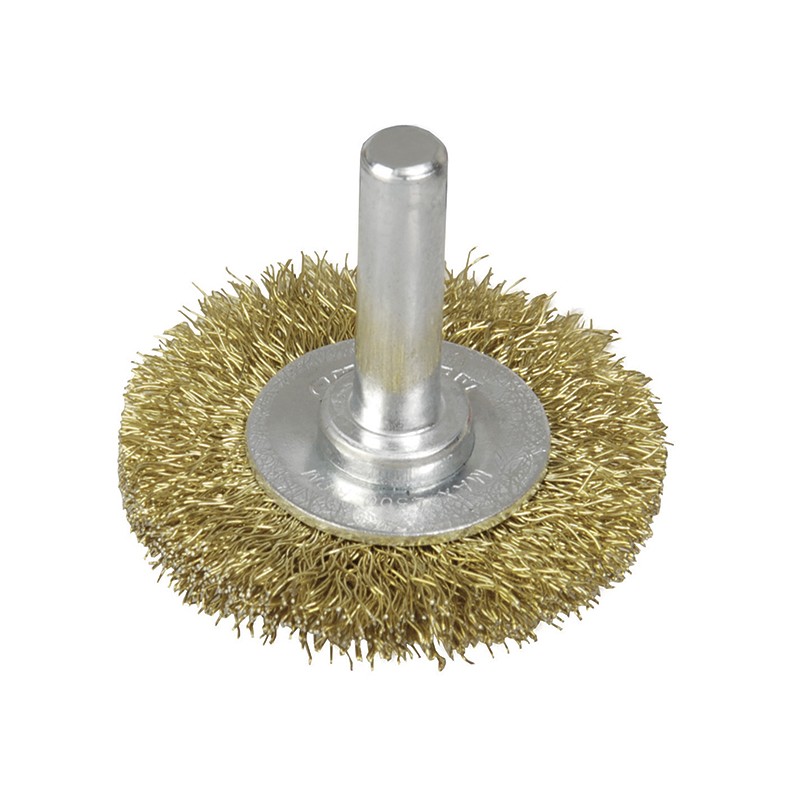 CARDA CIRCULAR CON ZANCO DE 1/4", TIENE UN DIAMETRO DE 2", ALAMBRE ONDULADO DE ACERO DE CARBONO, CERDAS EN ACABADO LATONADO.