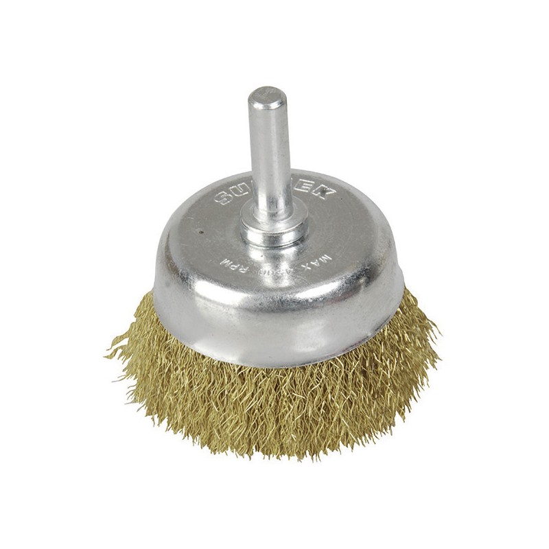 CARDA DE COPA CON ZANCO DE 1/4" DIAMETRO 1-3/4", MAX.4500RPM, ALAMBRE ONDULADO DE ACERO DE ALTO CARBONO, CERDAS CON ACABADO LATONADO.
