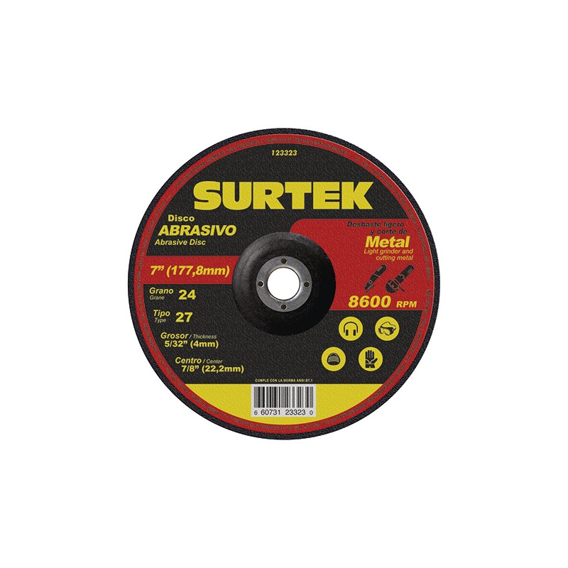 DISCO ABRASIVO PARA DESBASTE LIGERO Y CORTE DE METAL TIPO 27, PARA ESMERILADORA ANGULAR PARA TODO TIPO DE ACERO, FUNDICIÓN Y SOLDADURA, GRANO 24, CENTRO DE 7/8" MATERIAL ÓXIDO DE ALUMINIO.