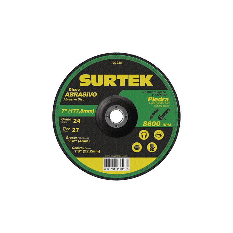 DISCO ABRASIVO PARA DESBASTE LIGERO Y CORTE DE PIEDRA DE 7" , PARA CORTAR Y HACER DESBASTES LIGEROS PARA TODO TIPO DE PIEDRA, CONCRETO, LADRILLO, REFRACTARIO Y PIEZAS DE FUNDICIÓN GRIS, PARA ESMERILADORA ANGULAR. GRANO 24, CENTROS DE 7/8" MATERIAL CARBURO DE SILICIO.