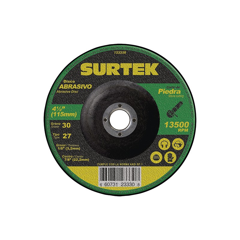 DISCO ABRASIVO PARA CORTE DE PIEDRA DE 4-1/2" ESPESOR DE 1/8" PARA CORTAR TODO TIPO DE PIEDRA, CONCRETO, LADRILLO, REFRACTARIO Y PIEZAS DE FUNDICIÓN GRIS, PARA ESMERILADORA ANGULAR, GRANO 30, CENTRO DE 7/8" MATERIAL CARBURO DE SILICIO.