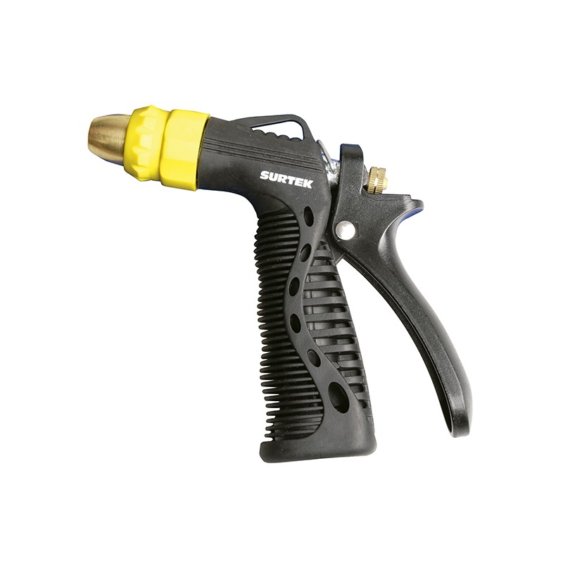 PISTOLA PARA RIEGO BOQUILLA REGULABLEMETÁLICA, CUENTA CON SEGURO PARA RIEGO CONTINUO. CUERPO DE SIDEÑO ERGONOMICO RECUBIERTO DE PVCANTIDERRAPANTE, CHORRO REGULABLE.
