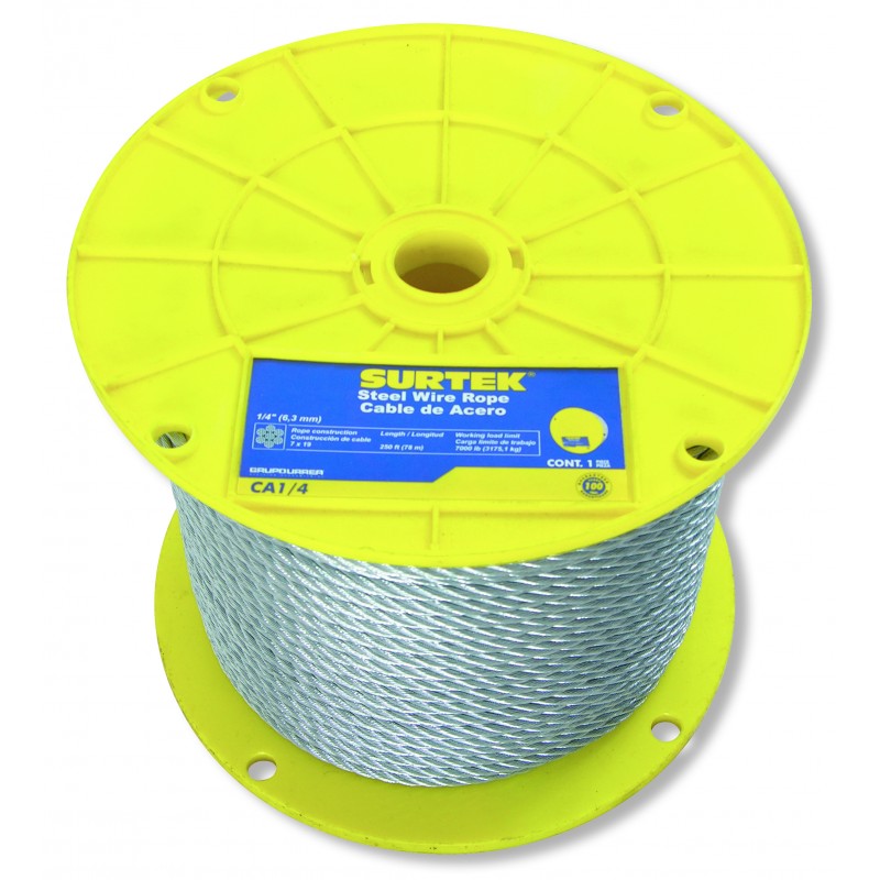 CABLE DE ACERO DE 7X7 QUE OTORGA MAYOR RIQGUIDEZ Y CABLE DE ACERO DE 7X19 QUE OTORGA MAYORFLEXIBILIDAD, FAV¡BRICADO EN ACERO ALEADO CON ACABADO GALVANIZADO. VIENE EN CARRETE DE 75 MTS