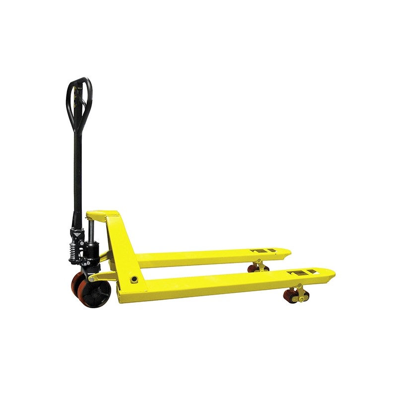 TRASPALETAS CON RUEDAS DE POLIURETANO MANIJA DE CONTROL DE 3 POSICIONES, 1. LEVANTE, 2. MANEJO CENTRAL Y3. BAJAR AUTOMATICAMENTE A POSICION CENTRAL, TIENE UNA CAPACIDAD DE 2 TONELADAS.